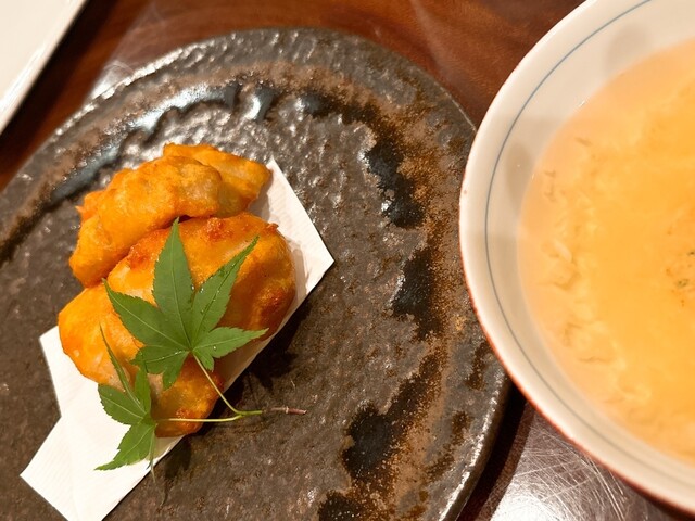 ハモの唐揚げは予想していたモノとは全く違いました。骨ぎりした身を唐揚げにしているなではななくて、ハモのすり身ナゲットですかね。周りはサクッと中はフワフワで、それがサッパリした梅酢おろしのタレにとてもマッチしていました。エビのチリソースは「アレ?ふわふわ玉子は何処へ行った?と思ったらフワフワ玉子の上にエビチリが餡かけになっていました。何時もながら美味しく頂き、主役さんも大満足との事でした。