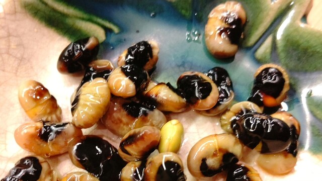浸し豆は鞍掛豆というお豆なんですね、黒いのは煎ったからでなく、こういう鞍の掛かったようなお豆なんだとか。