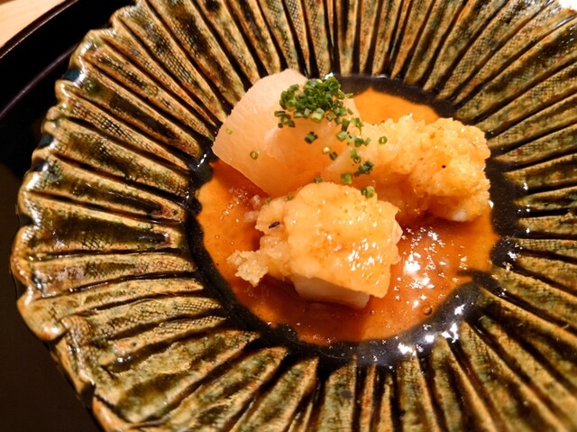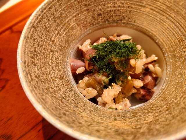あん肝に八丁味噌を練り込んであって、刻んだ沢庵のアクセントと、香りの良いカリカリのシャリのおこげといただきました