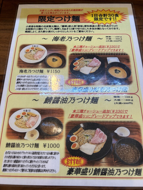しかしながら、今までに食べた海老ラーメンの中で一番のお気に入りメニューが、昭和呈の『究極海老花麺』でしたので、春花の店主に強くライナップ希望をお願いしたところ、『昭和呈の大将に確認します』との事でしたので、本当の意味での復活に期待しています♪