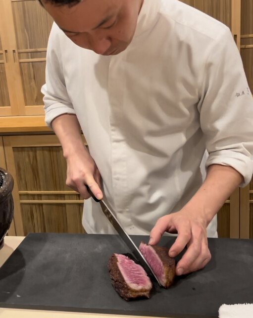 飛騨牛炭火、玉鋼焼きからの切った断面を玉鋼で更に焼き目を付ける