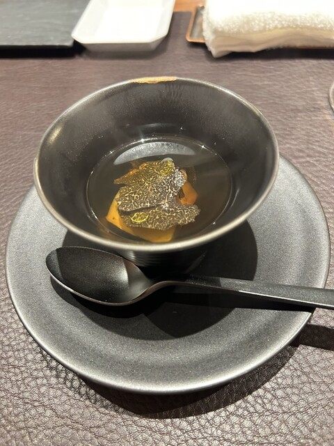名古屋コーチン出汁のスープ、黒鮑(千葉)、黒トリュフ