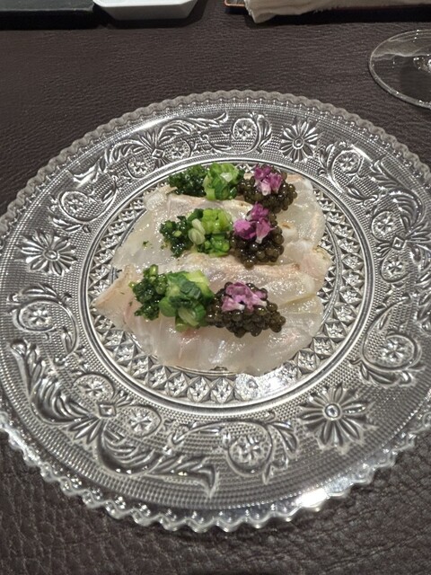 クエ(6日寝かし)皮目を炙って、オシェトラキャビア、行者にんにく