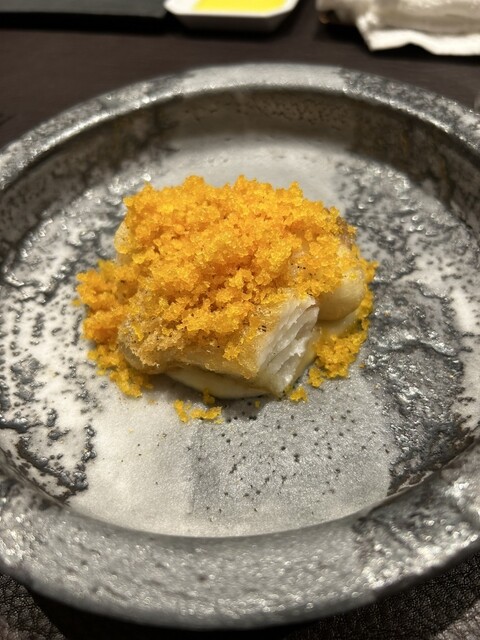 ◎ひらめ(三河産、4kg)のフリット、菊芋のソース、ワインで塩抜きした自家製カラスミのパウダー