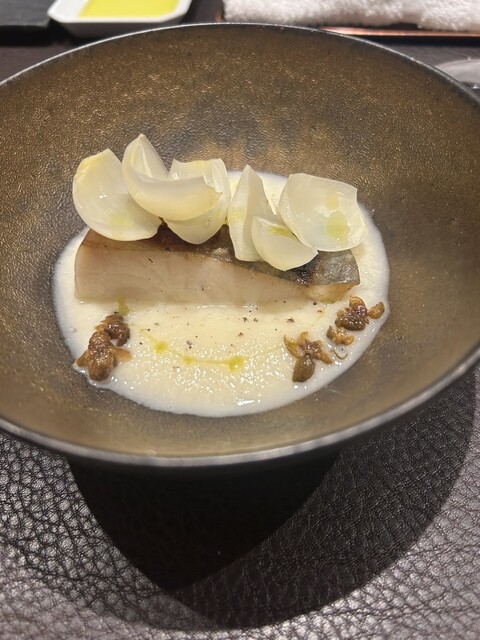 まなかつお(岡山産)炭火焼き、月光百合根、聖護院蕪のソース、素揚げしたケッパー