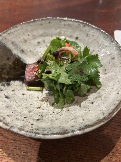 ◎イチボのロースト、パクチー、焼き茄子ソース