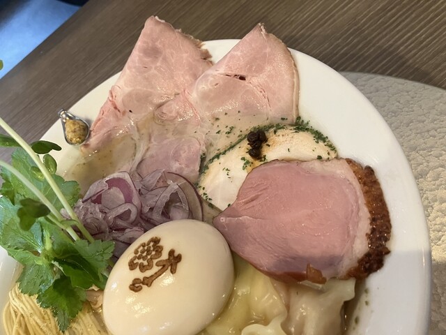 山椒そば1350えん 久慈軍鶏の半熟卵150えん 肉・海老ミックス雲呑240えん(全て当時の価格)