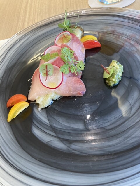 しばらく待っての前菜は…ブリのミキュイ、焼きナスのマリネ。