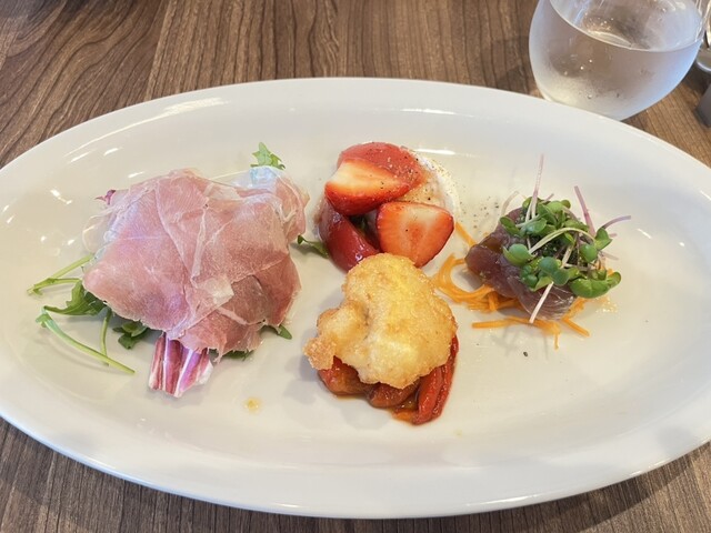 生ハムメロンでなく生ハムスイカの相性もバッチリ。イチゴのカプレーゼも爽やかで美味。季節感もあり鮮やかな赤色が彩り的にも最高。
