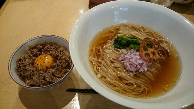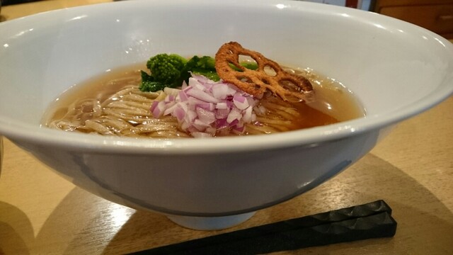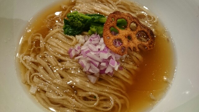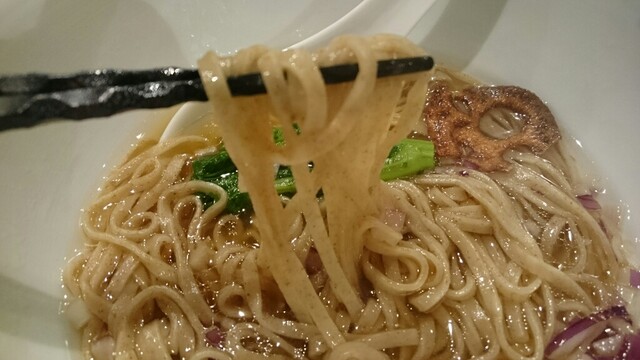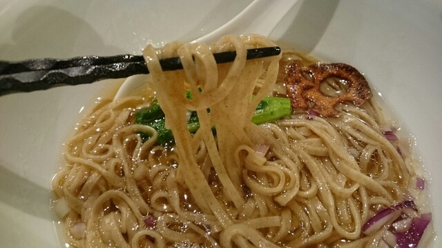 なんと言うbronze色のスープ!!浮いたgoldは鶏油?それもと牛脂?マジ、コンソメスープ激ウマっす。昨日、お茶の水で食べた牛アキレス腱のスープも旨かったが、このコンソメは別次元ッス!麺は、通常とは異なる、このスープ専用の全粒粉入り平太麺。かけそばな理由が分かります。トッピング、要らないもん。レッドオニオンももっと少なくていいよね。