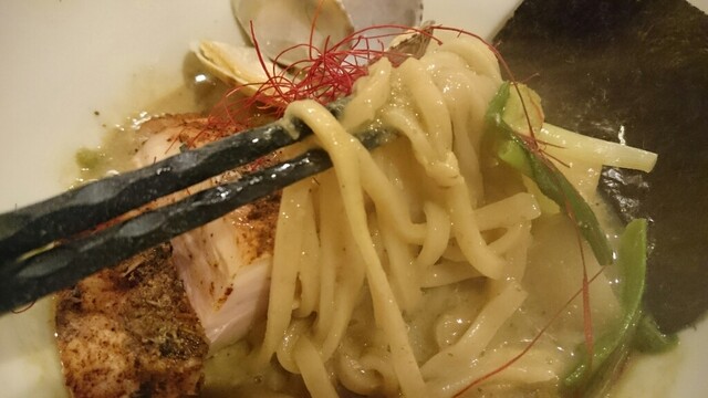 って、あさりの出汁がパワーアップしてるじゃないですか‼︎スープもさらに濃厚ドロドロに。昔の味噌よりはまだスープ量があるので平麺にスープが絡まることこの上なし。旨い‼︎