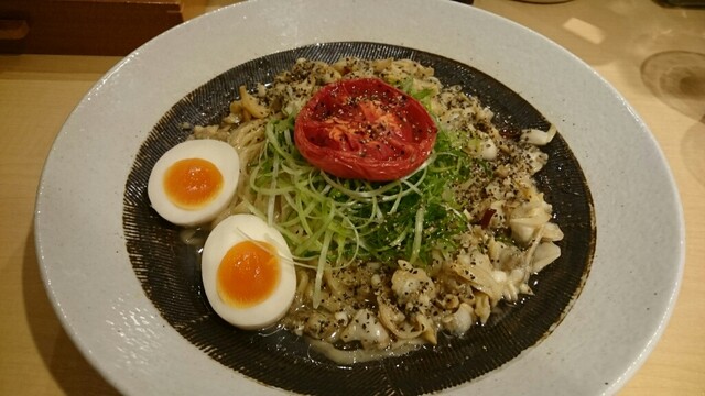 先ず、ローストトマトの入った鰹だしスープ。鰹の濃い出汁にトマトの仄かな酸味。麺をつけても、和えそばにぶっかけても、そのまま飲んでも、何でもありとの店員さんの説明。