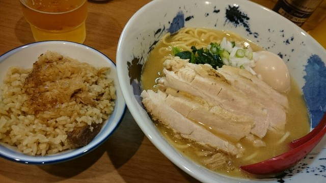 麺は極太縮れ麺。海苔1枚とバラチャーシュー1枚、刻み玉ねぎと水菜が乗っかる。