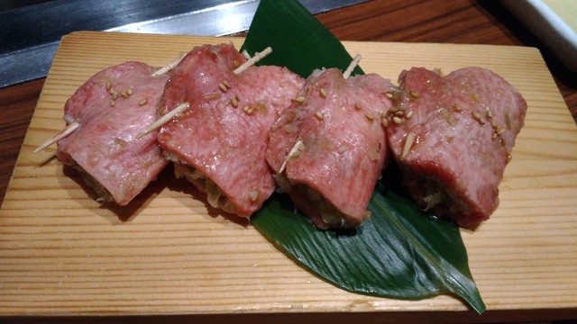 一頭から数人前しか取れない、貴重な霜降りタンをたっぷりのネギに包み込んだ、