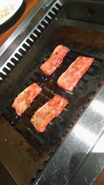 上ロースにもあらかじめ自家製たれがつけてあるのですが、鉄板の上に置いたお肉に塩昆布とわさびをつけて、さっと炙る程度で十分いただけるお肉。