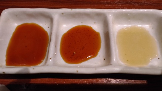 あらかじめ下味はついているのだけれど、お好みで3種類のたれがデーブルに用意されています。いちおいうどの部位のお肉にオススメなのはこのたれ、という説明書きもあります。
