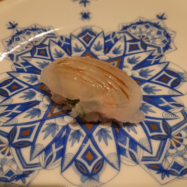 最初は、淡路島さよりから。淡白な味だけど、このあっさりしたのが美味しいお鮨。こちらはネタにお醤油をつけてあるので、そのままつまんでいただきます。