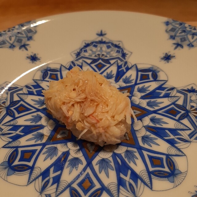 かには、毛ガニでカニ味噌と身をあえて、シャリにのせてあります。カニ味噌がはいっているから風味がまして、毛ガニの味がより美味しくなっています。いろんな種類のかにがありますが、毛ガニが一番身がしまって大好きな食材の一つ。