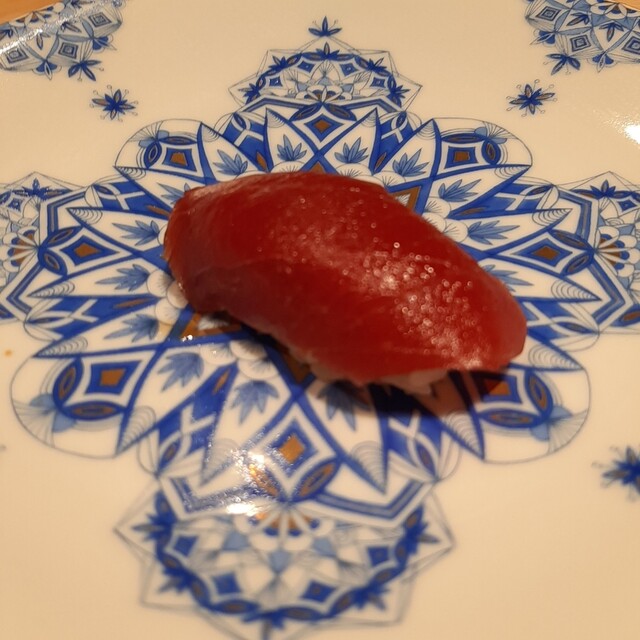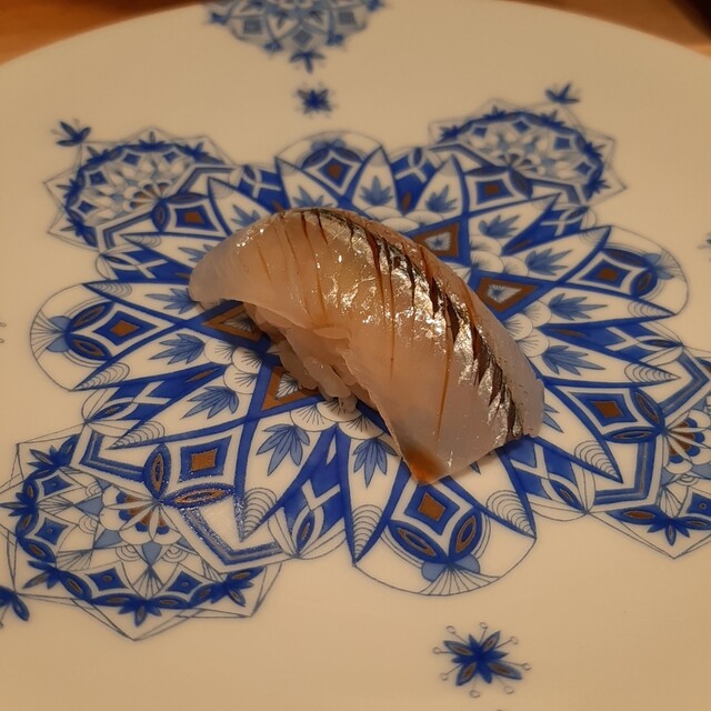 そしてお皿は特注の九谷焼だそう。ブルーがお鮨に映えるお皿で、とても素敵。