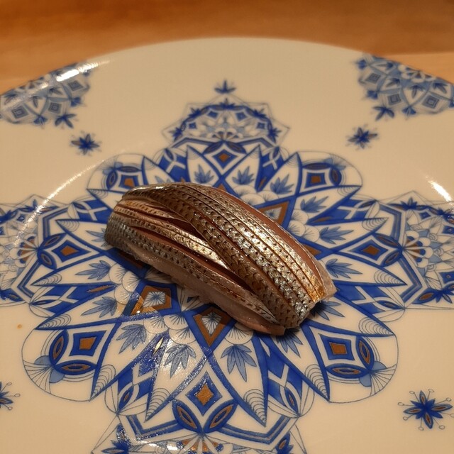 小鰭。ヒカリモノは綺麗ですね。酢がきいていて、さっぱりといただけるお鮨。
