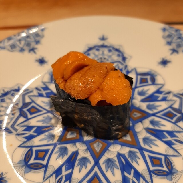 大好きなウニは、巻物で。釧路産バフンウニ。最近はウニが不漁と聞いていたけれど、モリモリと盛っていただきました。ウニのトロリとした甘さが堪能できる一品。やっぱりウニはお鮨やさんでマストでいただきたいお鮨です。