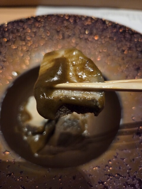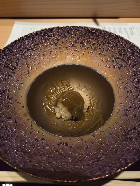 鮑の酒蒸し肝ソース添え。下にソースがあるので、身にたっぷりつけていただきます。濃厚な肝ソースが美味しい。 この後、空になった器に、赤シャリを加え、その上から煮詰めた肝ソースをオン。このソースとよーく混ぜてリゾット風にしていただきます。これが、おかわりしたくなる美味しさ。
