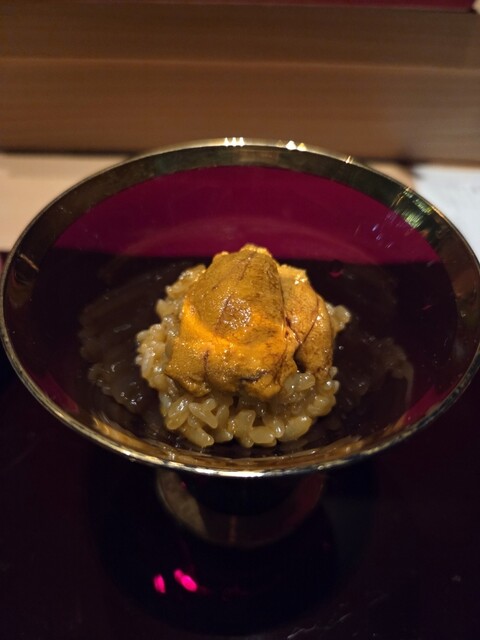まずは、お店の名物という、ウニパフェ。たっぷりウニがのっていますが、赤シャリにもウニがよく混ぜ込まれていて、かなり濃厚なお味となっていますが、絶品!この日は根室のキタムラサキウニを使ったそう。器もほぼ全てオーダーで作成していただいたものだそうで、とても素敵です。