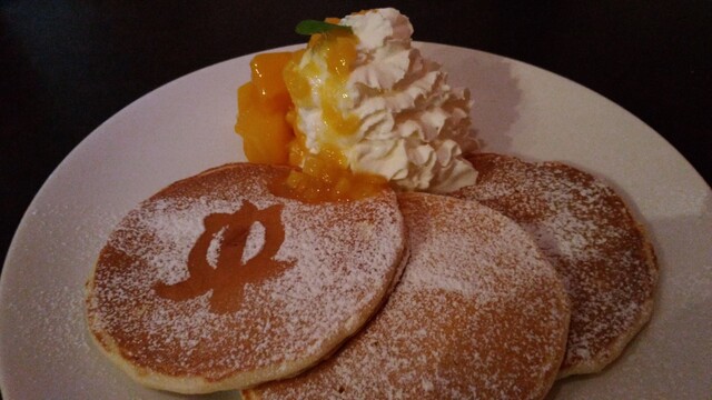 結構おなかがいっぱいなんだけどね、私はスイーツも大好きなので、リリコイソースのマンゴーパンケーキのハーフサイズも頼みましたよ。