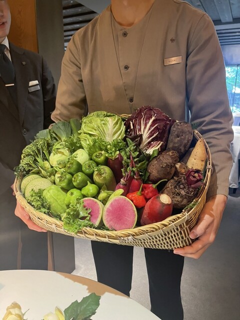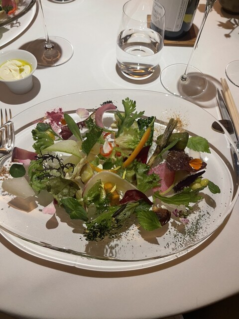 料理のスターターとして提供された「60種類の野菜のサラダ」は圧巻。さまざまな色・形・味わいの野菜が一皿に美しくまとめられ、それぞれの野菜が持つ個性を一口ごとに楽しめる構成でした。フレッシュさだけでなく、火入れやマリネ、ピューレ状など多彩な調理法で仕上げられており、野菜のポテンシャルをここまで引き出せるのかと感心しました。