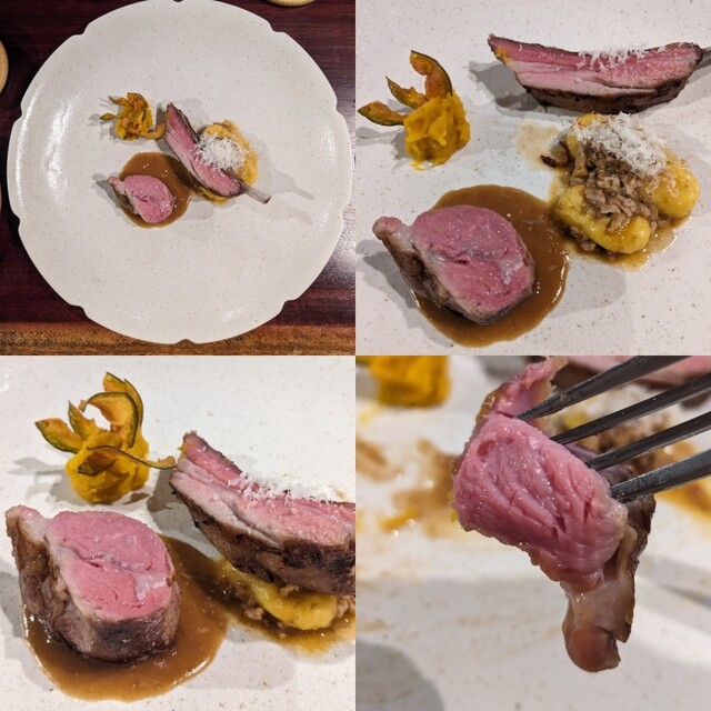 シストロン仔羊ローストにローズマリージユソース、バラ肉ラグーニョッキ、スパイス南瓜ペーストにチップのアクセントで戴くビアンドの一品。
