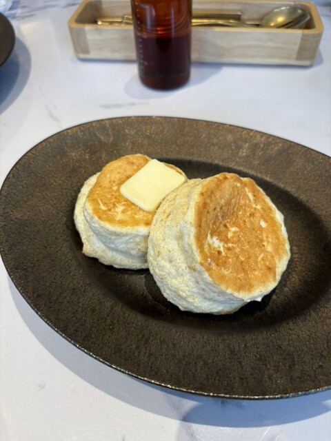 パンケーキは、想像以上に軽い食べ心地で、お腹にもたまりません!ほぼメレンゲなんじゃないかなって感じだけど、全粒粉の食感と、有塩バターの塩っぱさがとっても美味しくて、そのままで完食しちゃいました!!