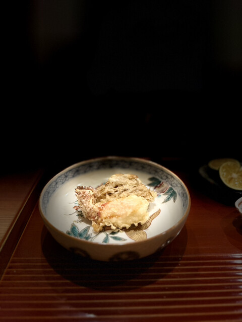 蟹脚の天ぷらは、外はサクサク、中はしっとり。蓮根が添えられ、食感も楽しめる仕上がりでした。