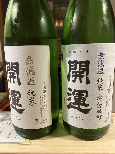 お酒はまずはお約束の開運無濾過純米で始める。