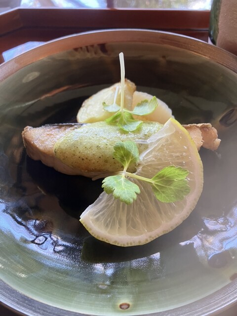 鮮魚のポワレは鮭にバジルクリームを合わせてある。
