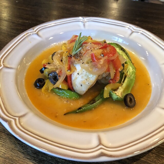 前菜のサラダは、切り立ての生ハムが、ホワッとのって、中には、焼き野菜が。土台の葉物には、赤玉ねぎのドレッシングで酸味が少なく食べやすい優しい味で美味しかったです。