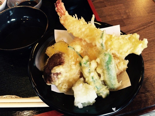 天婦羅定食の天婦羅(海老2匹、蛸、ししとう、茄子、サツマイモ、しいたけ)は専門店のような薄いサクサクの衣ではありませんでしたが、適度な厚みのある美味しい衣で上手に揚がっています。