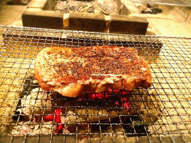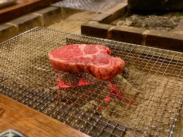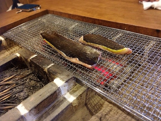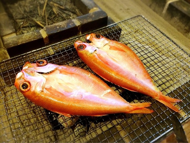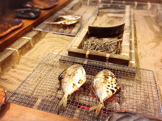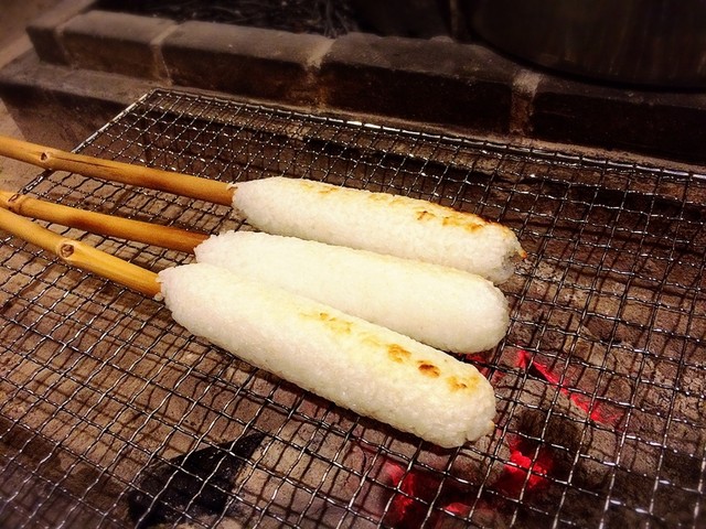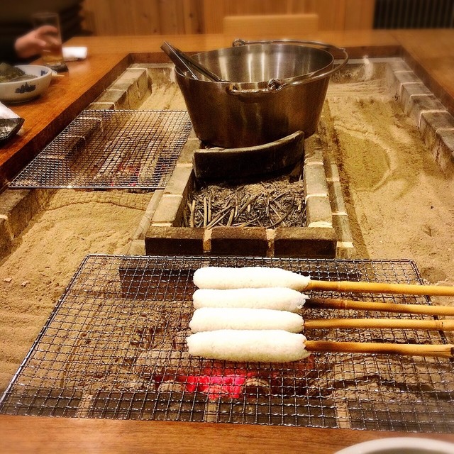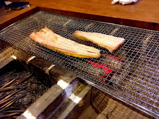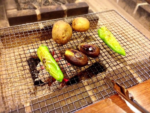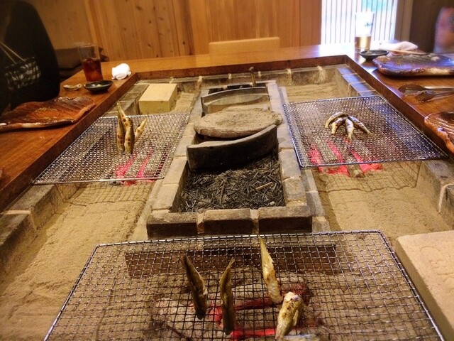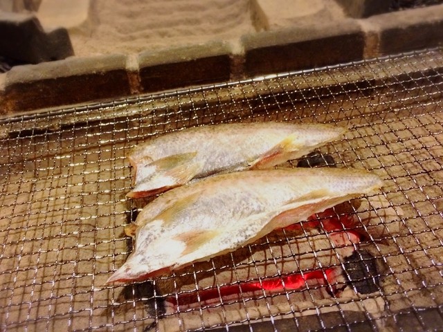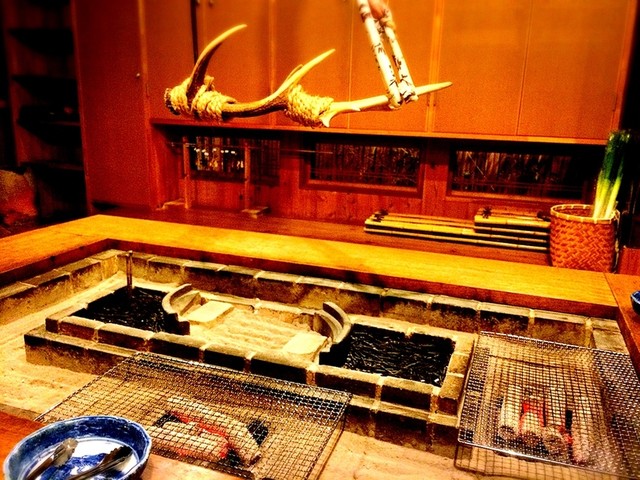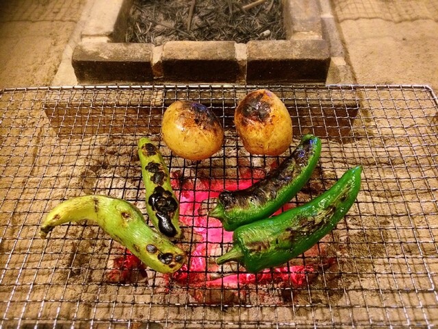 囲炉裏で焼かれる焼き物は安定の美味しさ。