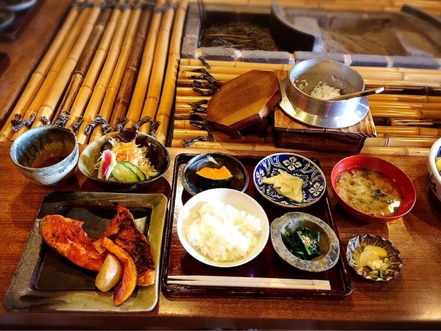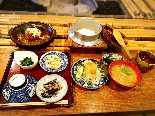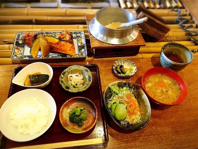 それにおばんざい3種とサラダ、豚汁、釜炊き御飯、お漬物、食後のドリンク(珈琲or抹茶)
