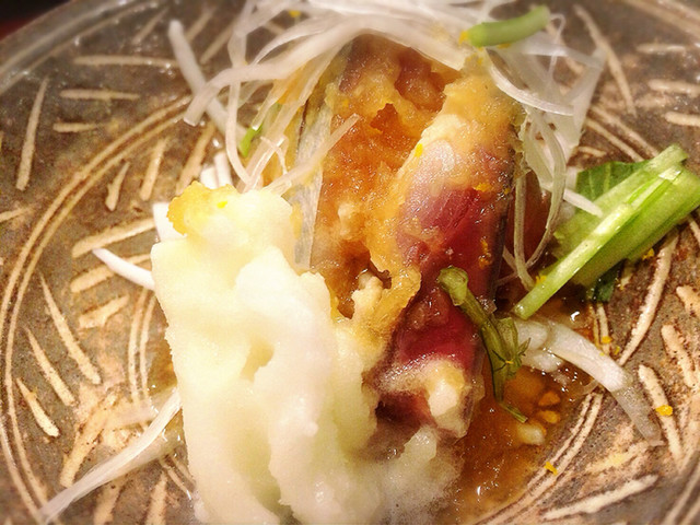 キュウリと赤玉葱がそこに敷かれており、酸味強めのポン酢がかけられていました。