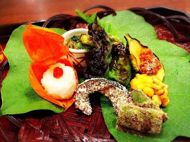 無花果のきな粉酢、杉谷唐辛子、下田茄子の田楽、玉子焼き、菊の花に見立てた鱧寿司、秋鯖の燻製胡桃射込み、