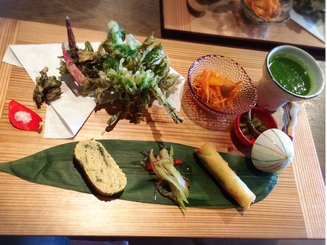 長芋と摘み草だし巻き、野草の天ぷら、摘み草料理、帆立とこごみの揚げ春巻。