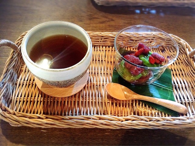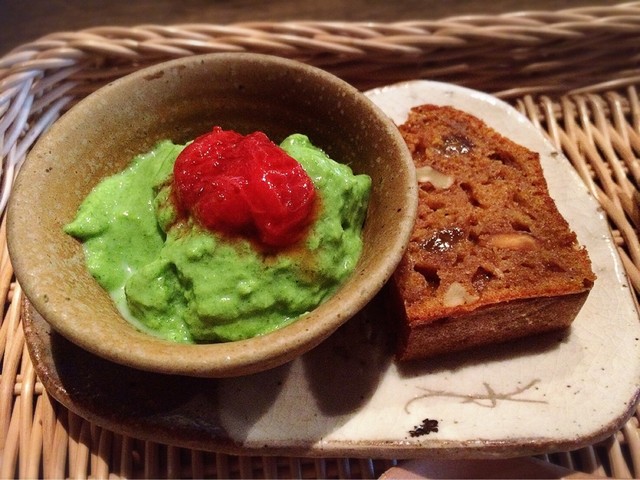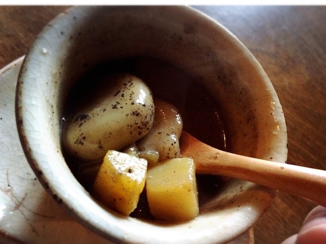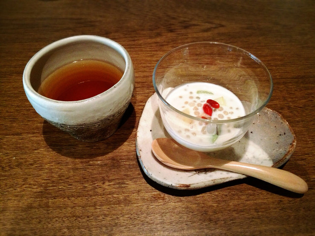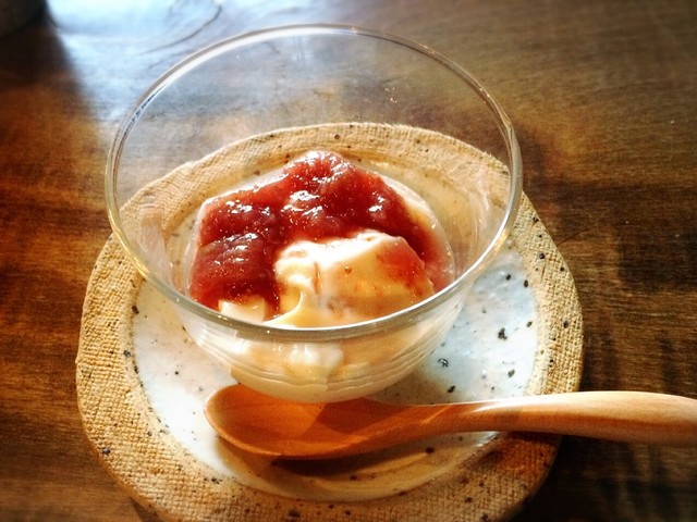(2017年9月)デザート 杏仁豆腐いちじくのソースと薬草茶 手作りのいちじくソースは果肉感があって美味しい♪そして…杏仁豆腐。 ちょっとヤバいですよこれ…((ʘ ʘ)))