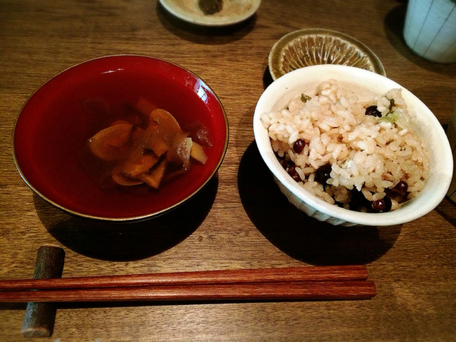 (2017年7月)ご飯・汁物 はと麦と豆のご飯、あさりの薬膳スープ