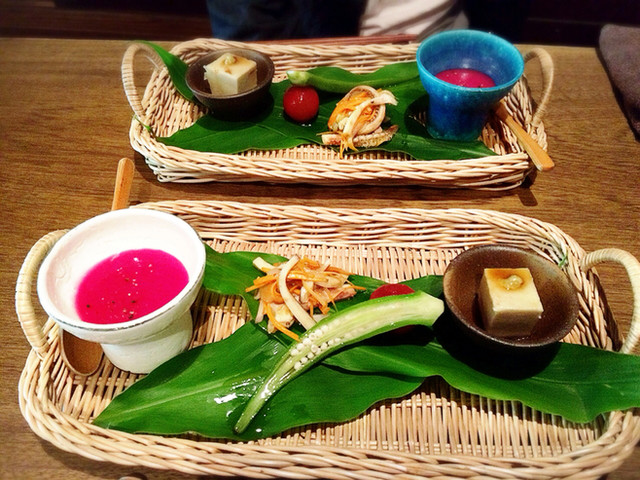 (2017年7月)前菜 ビーツのスープ、蕎麦豆腐、イカのカレーマリネ、オクラとトマトのおひたし