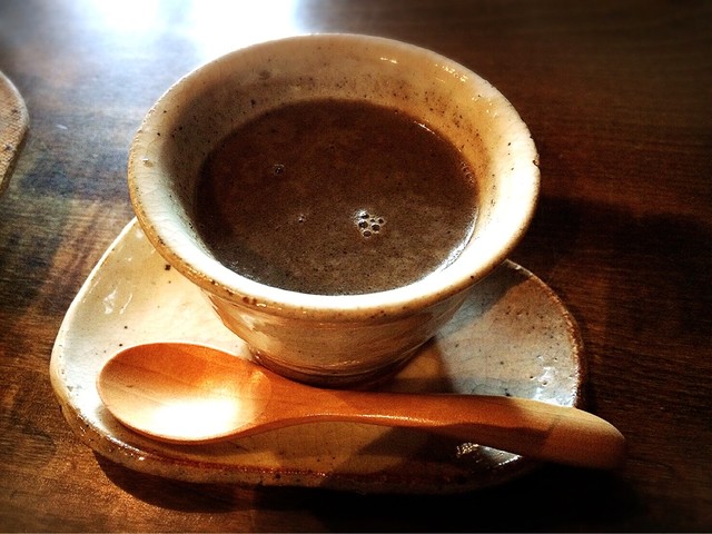 (2017年9月)牛蒡とマイタケのスープ 香りの強い野菜とキノコの組み合わせ。 主張し合うと思いきや…いい感じに融合♡ とても美味しいスープです♪