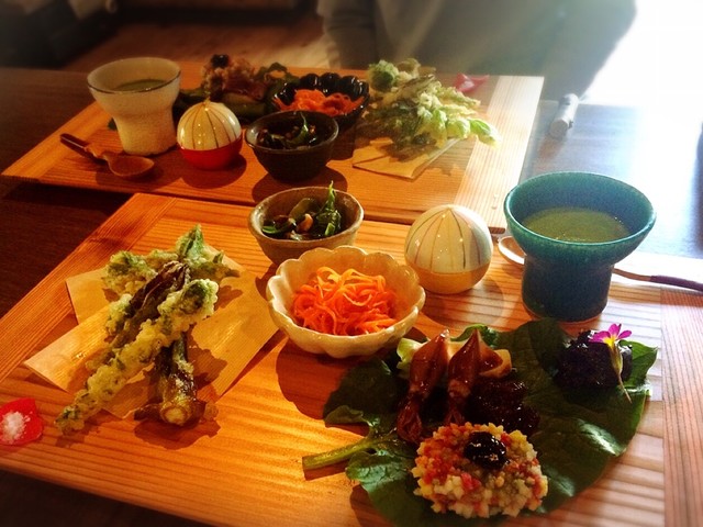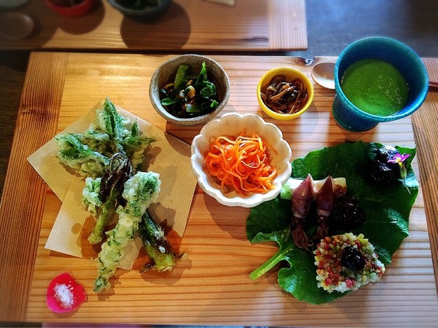 (2017年5月)おばんざい盛 野草と金針菜の和え物、枝豆・レーズンの塩レモン、車麩のトロトロ煮、野草の天ぷら