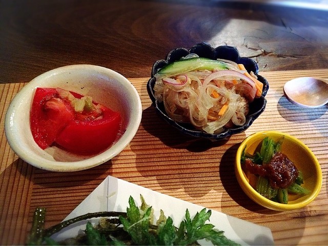 わけぎとイカの山椒みそ、ヤブカンゾウと金針菜のナムル。
