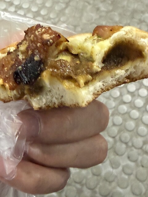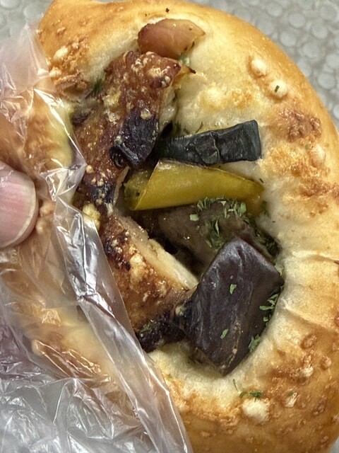 パンに野菜が乗ってるのですが、パン生地にカレーのペーストが入ってました