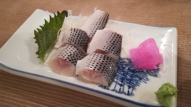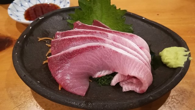 隣の常連さんっぽいお父さんがブリ刺身を頼み、寒ブリでサシが入って美味しそう。