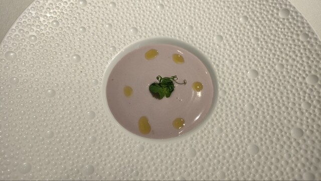 紫イモの冷製スープがサーブされる。